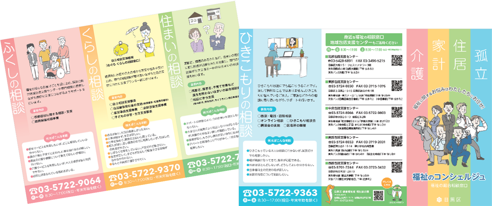 地域共生社会の実現に向けて、国が推進する「我がこと丸ごと」の方針を踏まえ、また、1つの窓口では対応が困難な複雑・複合化した生活課題に対し、ワンストップ型の相談支援が必要と考え、平成31年度に「福祉の総合相談窓口(福祉のコンシェルジュ)」を自立相談支援機関の機能も含む窓口として庁舎内に開設しました。地域の身近な相談窓口として包括的に相談を受けとめる地域包括支援センターの後方支援の役割も担い、8050のように複数の支援を要する世帯員のいるケースなどに対応します。保健師と福祉専門職が在席し、介護・家計・住居・孤立など福祉に関する相談全般を受付けています。