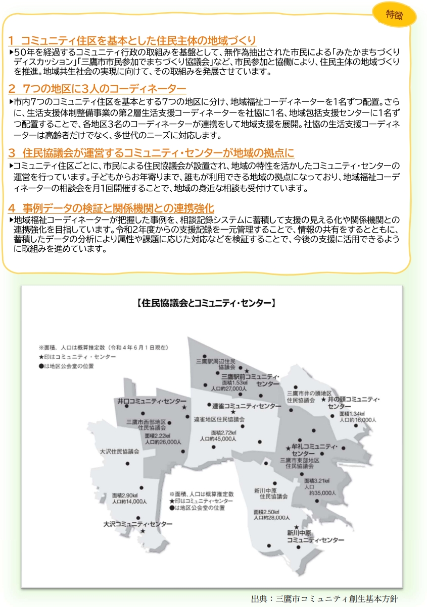 市内7地区のコミュニティ住区を基盤にした住民主体の地域づくり コーディネーターを各地区に配置し、市民と一緒にニーズに対応― 三鷹市における重層的支援体制整備事業の取組み
