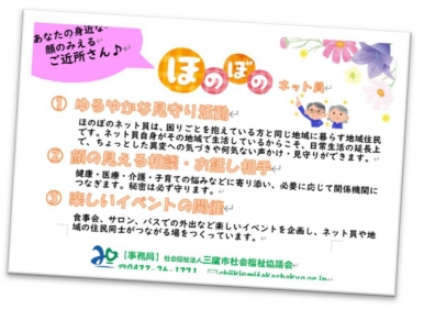 三鷹市社協では30数年前から、住み慣れた地域で誰もが安心していきいきと暮らせるまちづくりを目指して「ほのぼのネット活動」を地域の方と一緒に推進しています。民生・児童委員、赤十字奉仕団員、シニアクラブや地域の方達が「ほのぼのネット員」(ネット員)となって、ゆるやかな見守りや身近な相談相手として、サロンや食事会などの活動やイベントの開催など、市内28の班に分かれて活動しています。
