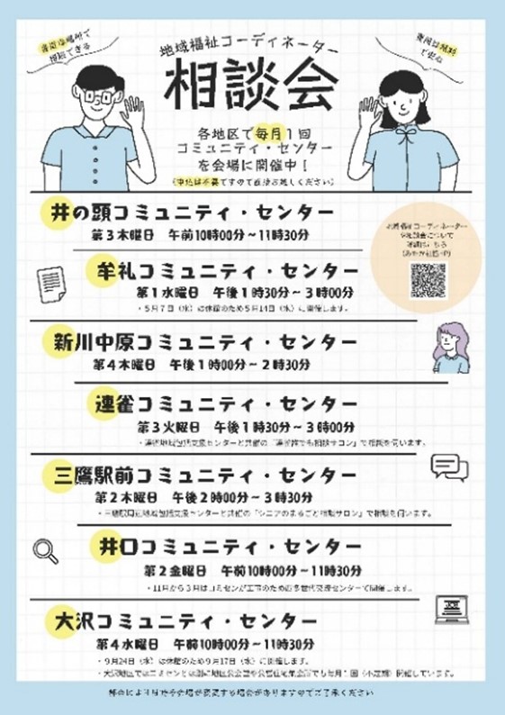 地域福祉コーディネーターはコミセンを利用した出張相談会を開催することで、市民のちょっとした困りごとの早期発見・対応を、地域の皆さんと一緒に取組んでいます。