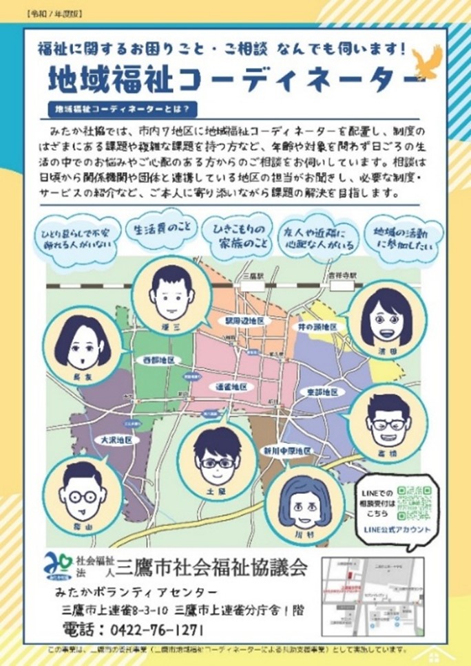 地域福祉コーディネーターは、令和2年4月に1名を大沢地区に配置し、令和3年4月に連雀地区に1名、令和5年4月に東部地区に1名、令和6年1月に更に1名を配置し4名体制になったところで、市内全域の相談を開始しました。そして、令和6年4月に3名を増員し7名体制となり、市内7地区に1名ずつ専任の担当者が配置されました。全員が、三鷹市上連雀分庁舎内にある「みたかボランティアセンター」の事務所に席を置き、必要に応じて担当地域の相談に出向いています。同じ事務所に、社協が受託している7名の生活支援コーディネーターも在籍しており、2名で地区担当をするような形で、日ごろから連携を取りながら対応をしています。