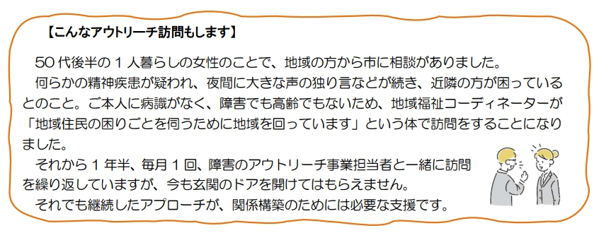 ほのぼのネット員や地域住民などから、『地域で気になる方がいる』『近隣住民が困っている』などの相談が地域福祉コーディネーターに上がってくることも多く、直接訪問して状況を伺うなど、プッシュ型やアウトリーチ型の相談等を実施し、継続的な支援を行います。8050問題など、世帯内に複数の支援を要する方の相談などの場合には、関係する支援機関と連携を図りながら支援を進めます。