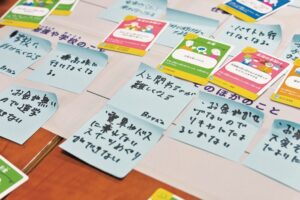 実際の授業では複数のグループに分かれ、架空のキャラクターを選び、そのキャラクターに起こりそうなピンチを付箋に書いていきます。さまざまな社会保障制度の内容が書いてあるカードをピンチに応じて選び、解決方法を考えていきます。ゲームに参加した生徒からは「社会保障を学ぶことで、自分だけではなく身近な人たちも助けられると思いました」という意見や「大人になって自分に何ができるのか考えるきっかけになりました」と話す生徒もいました。