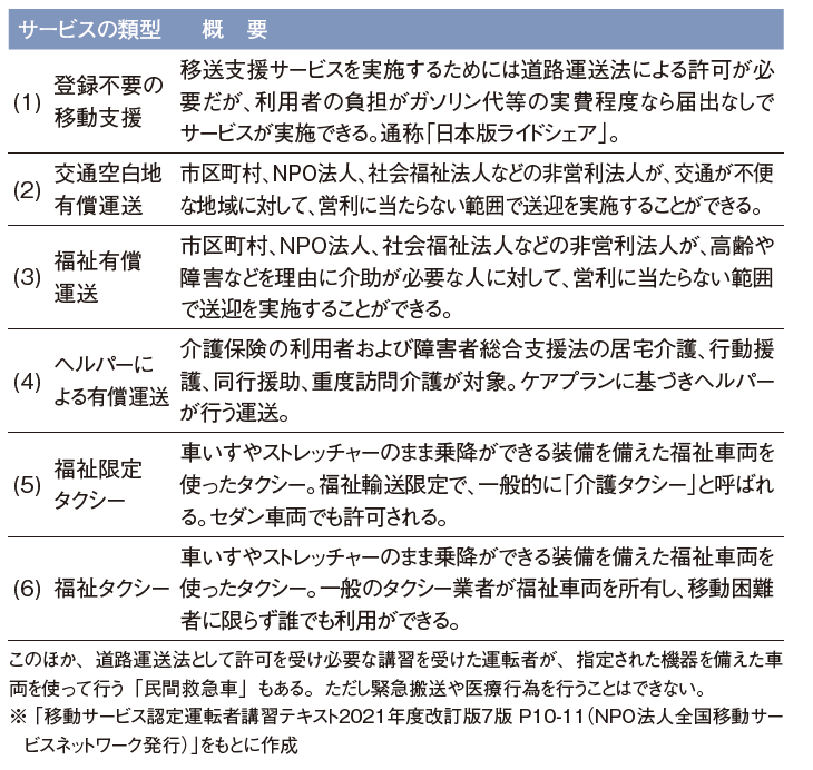 移動支援のサービスを実施する団体は、自治体や社会福祉法人、NPO法人などさまざまな主体があり、サービスの形態や利用料なども多様です。そのうち有償によるサービスは、道路運送法が定める範囲で決められていて、サービスの種類は次の表のように大まかに分類することができます。表中(2)は、地方では“ささえあい交通”として認識されていて、都内でも八王子市や町田市で運営されています。